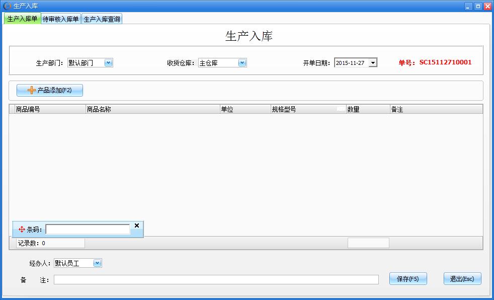 点击入库管理中的“生产入库”按钮打开如图窗口。