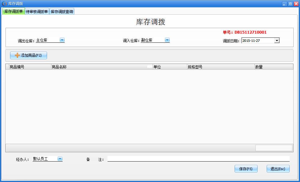 库存调拨单:该部分完成库存调拨;将物品从一个仓库调配到另一个仓库,按照界面的提示进行操作,点击'增加商品'按钮进入'增加商品'窗口,选择要调拨的商品;增加的商品将显示于'增加商品'按钮下的'调拨商品'表格中。 商品添加完成后点击'保存'按钮退出,即完成物品的调拨,已调拨的商品可以查询。 |